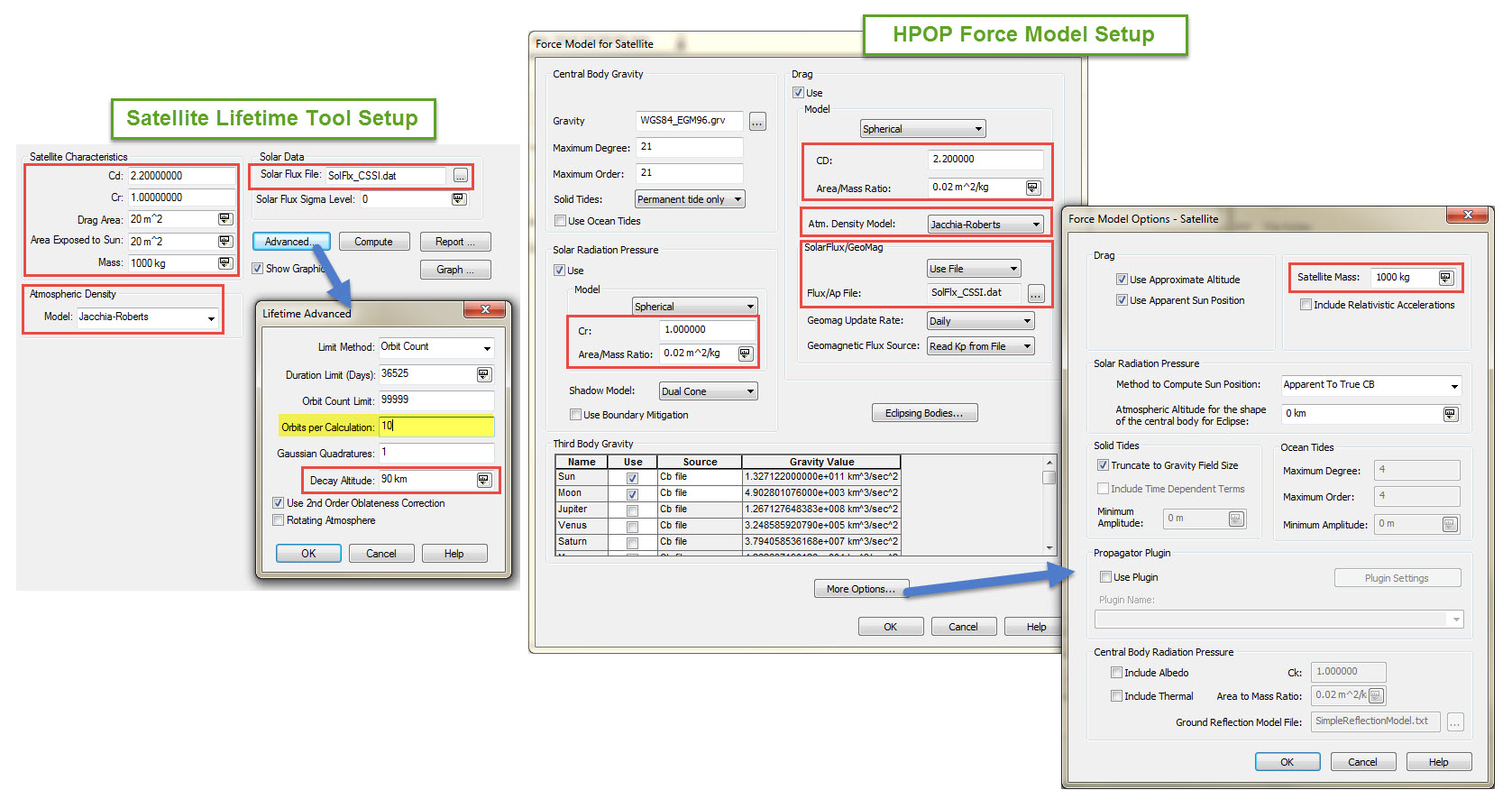 • Ensure that the Lifetime Tool and HPOP are using the same force modeling and drag conditions. The Lifetime Tool doesn’t have as many configurable properties as HPOP, but those it does have should match HPOP as closely as possible. For example, are you using the same Solar Flux files in the Lifetime Tool as in HPOP’s Force Model settings? See the boxes in the image below (and attached) for reminders of which properties to compare.