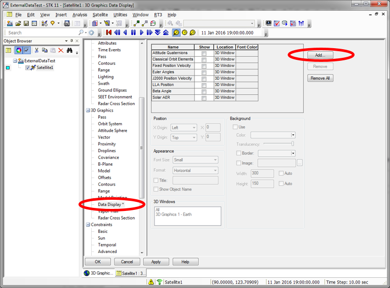 ExternalData */Satellite/Satellite1 ReadFile "C:\agi\STK11\ExternalDataTest\testExternal.txt" SaveNow that the data is read in and associates with the "Satellite1" object, you must generate a custom report of that data in order to display it on the 3D Graphics window. To create the report, open the Report & Graph Manager for the object of interest.