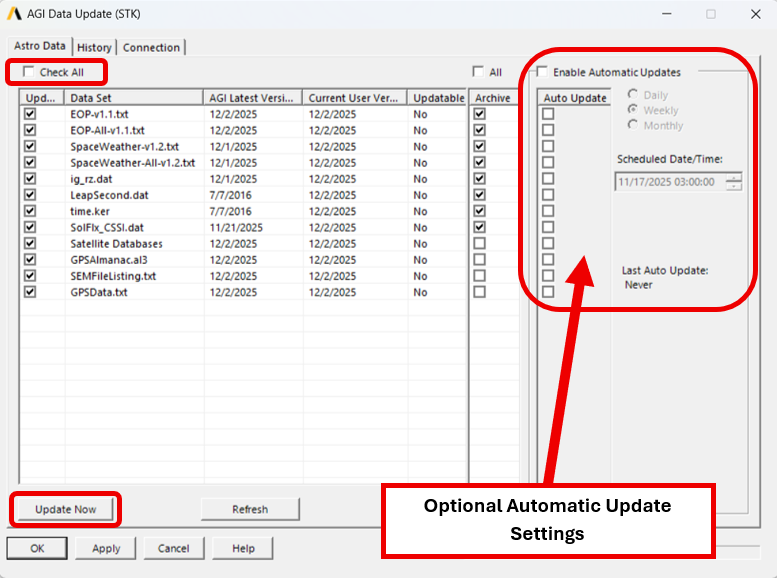 If no internet connection is available on the computer that is running the STK application, then you will have to download these files from a connected computer and manually transfer (sneakernet) them to the computer where you are performing your analysis. From a connected instance of the application, run the Data Update utility to download all the files shown above. STK will place these in the <CommonAppData>\AGI\<Application version>\ directory, for example C:\ProgramData\AGI\STK_ODTK 13.